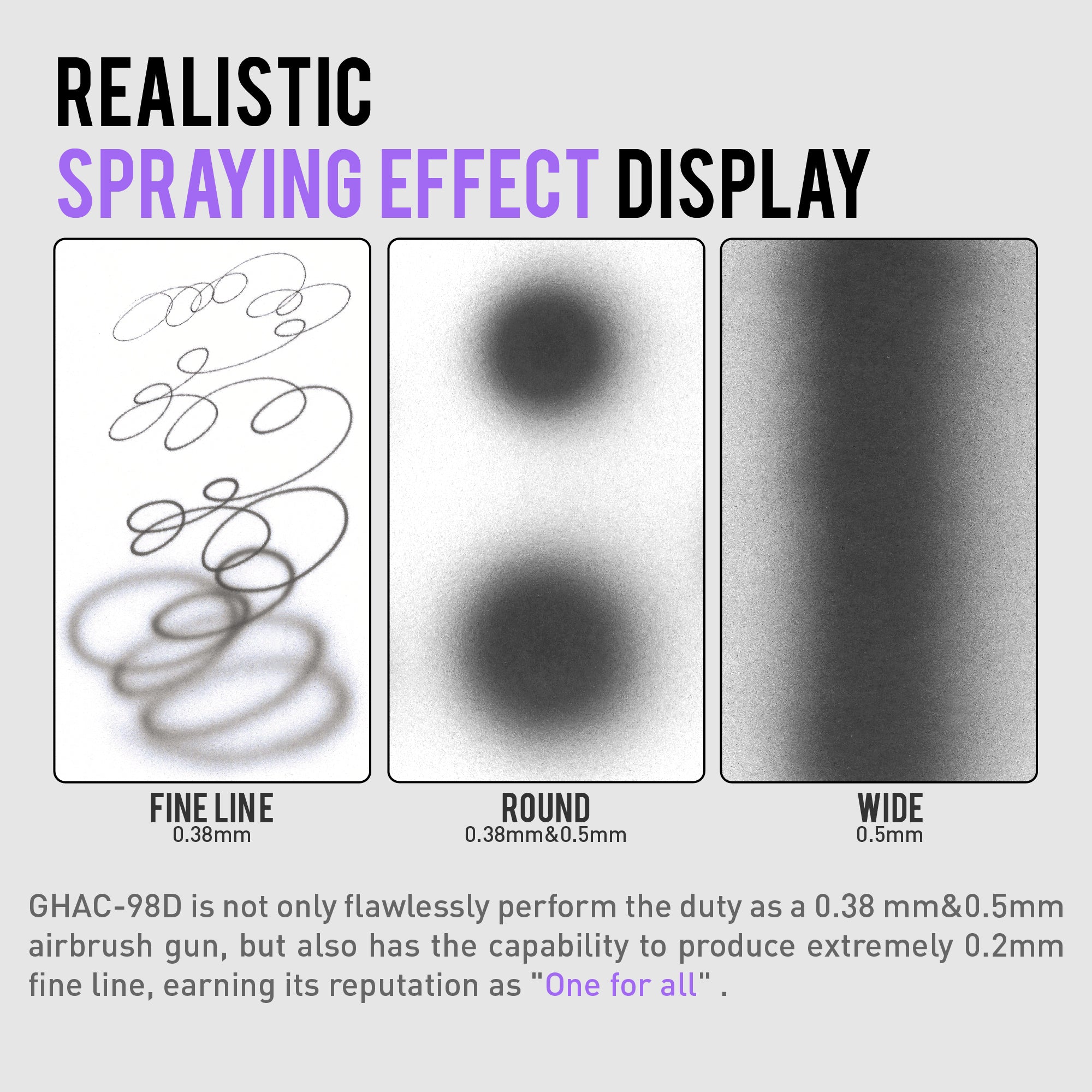Dual Nozzle Size: The GHAC-98D comes with both 0.38mm and 0.5mm needle and nozzle options, offering the flexibility to switch between fine detailing and broad coverage with ease.