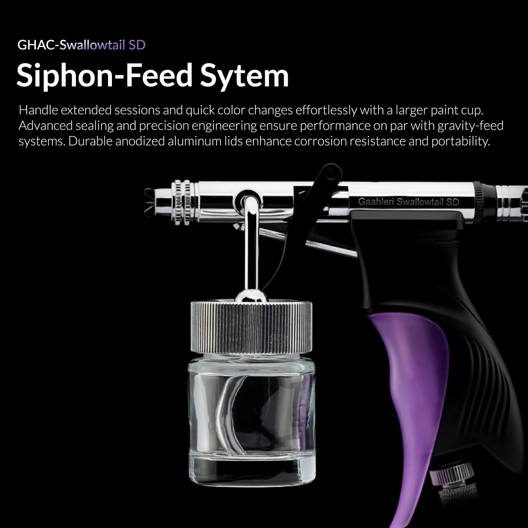 Handle extended sessions and quick color changes effortlessly with a larger paint cup. Advanced sealing and precision engineering ensure performance on par with gravity-feed systems. Durable anodized aluminum lids enhance corrosion resistance and portability.