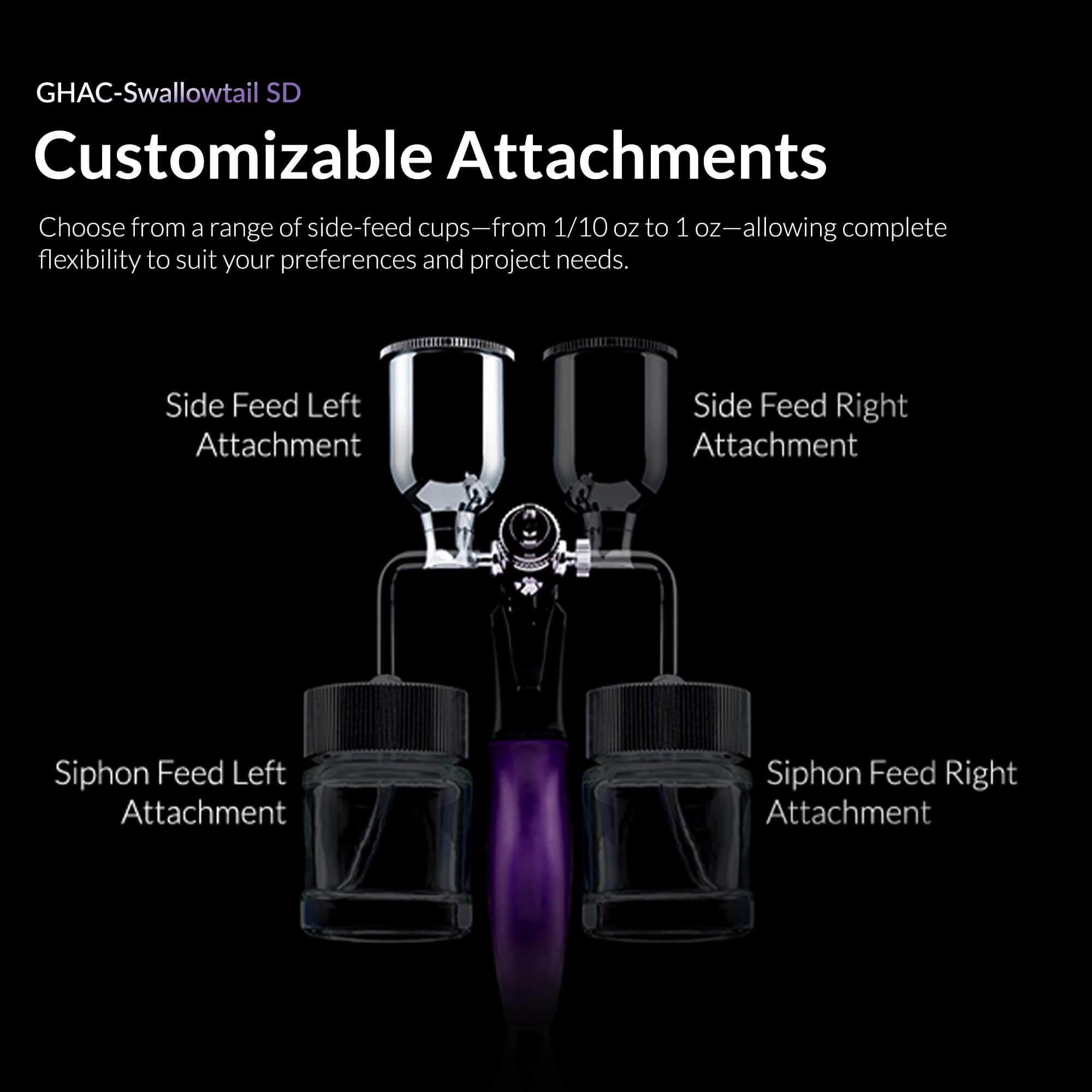 Choose from side-feed cups ranging from 1/10 oz to 1 oz. This flexibility allows you to tailor the airbrush to your specific project and preferences.
