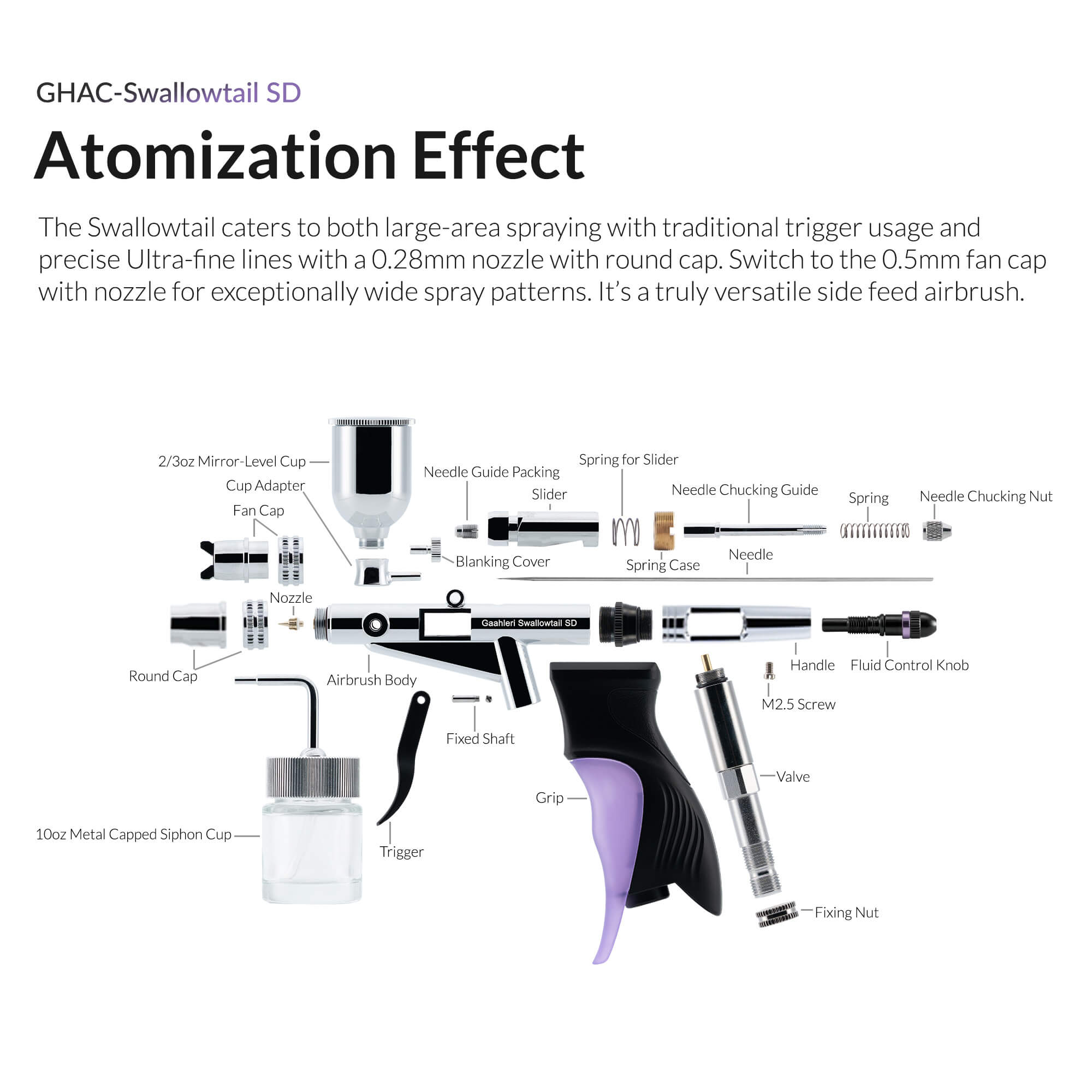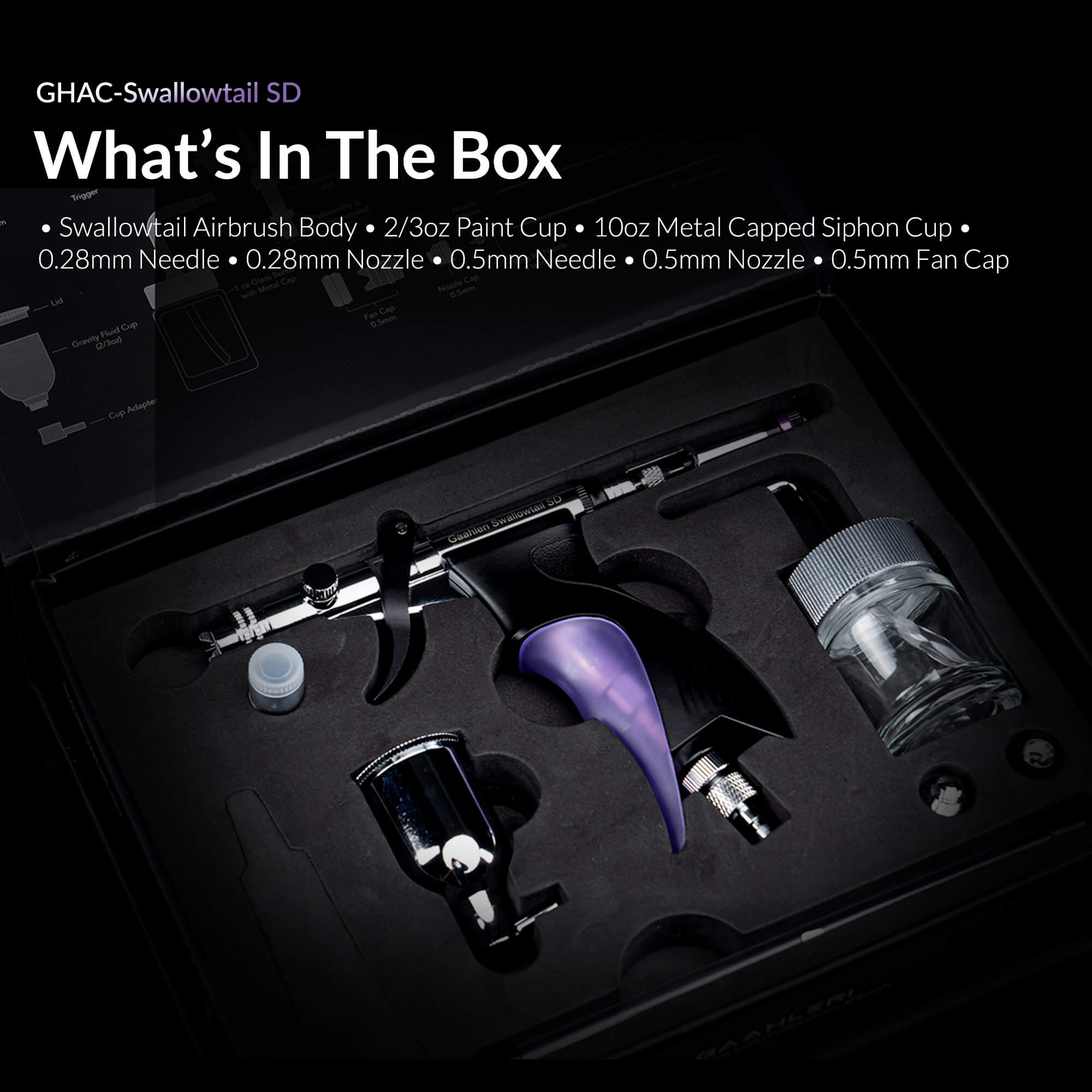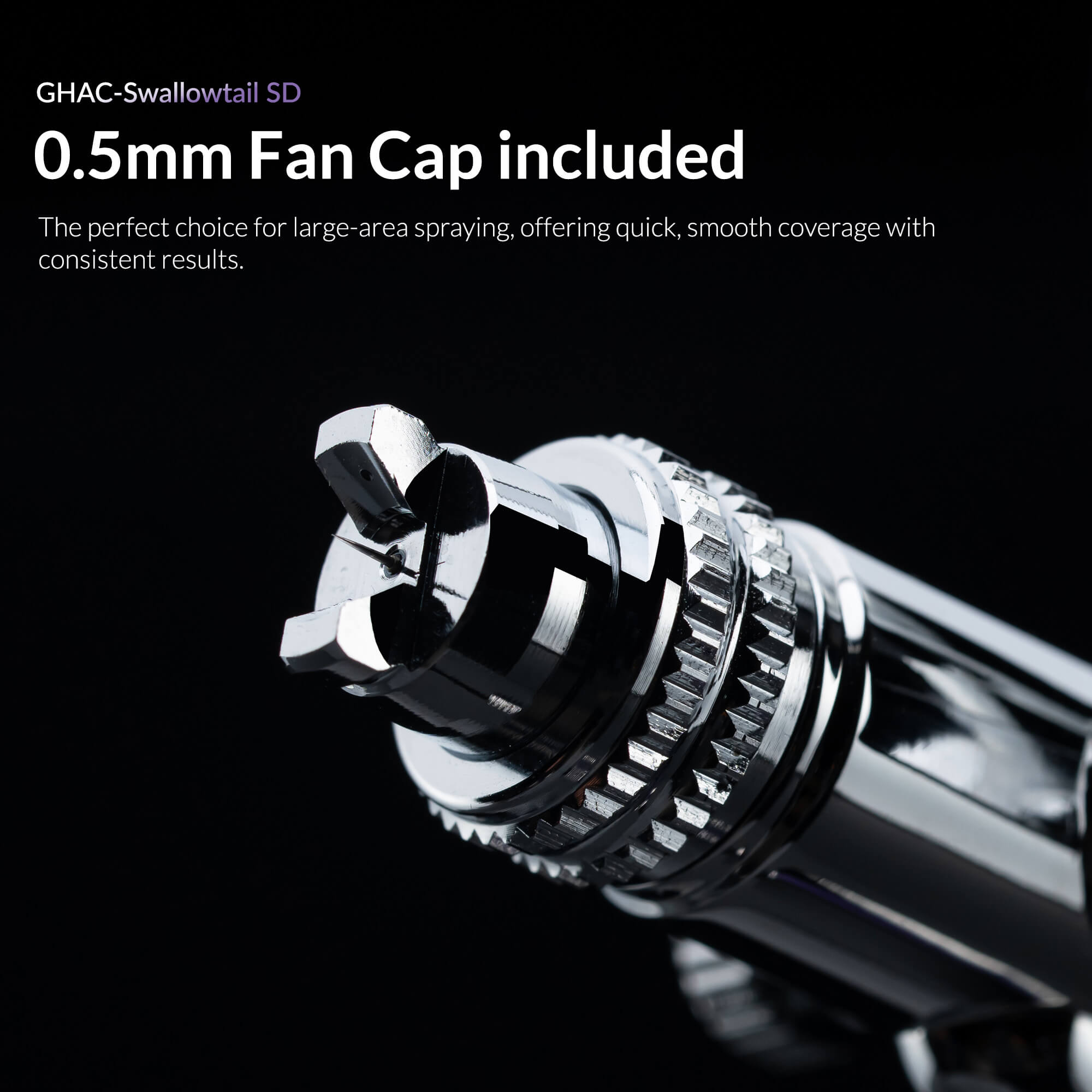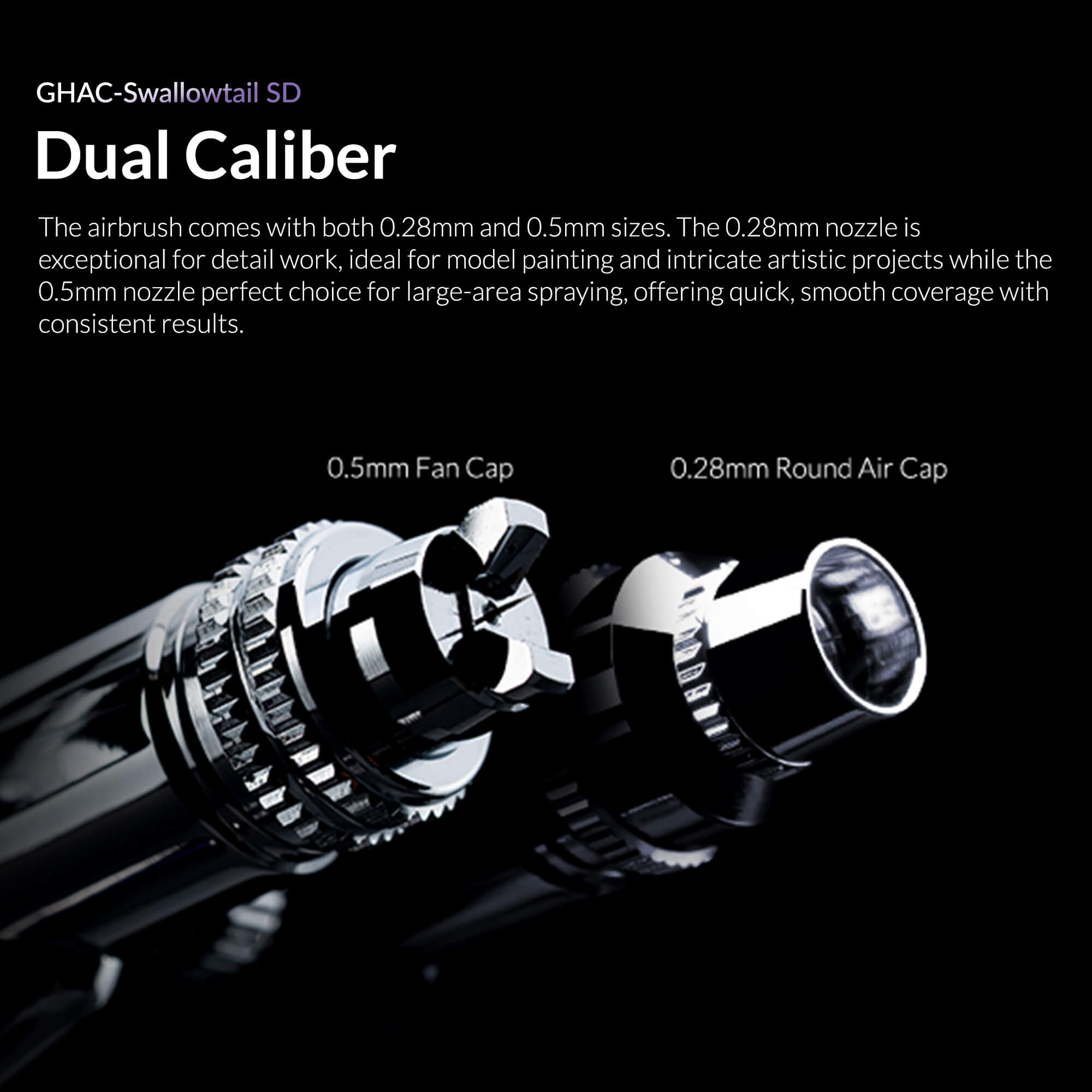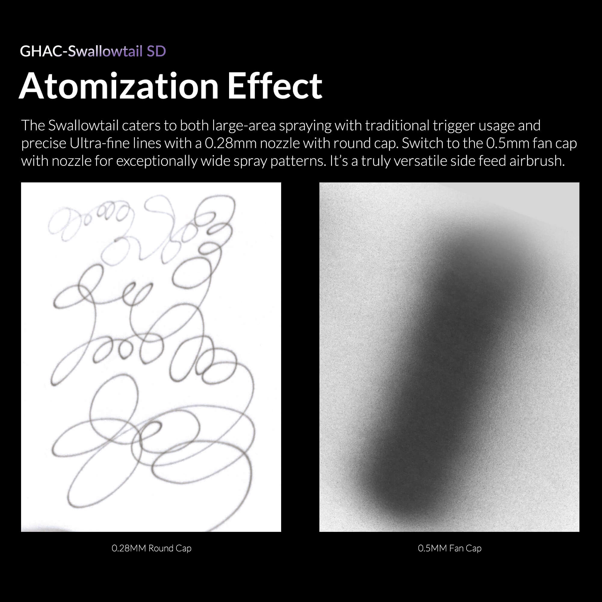 Equipped with both 0.28mm and 0.5mm nozzles, the Swallowtail is perfect for diverse applications. The 0.28mm nozzle delivers exceptional detail for fine artistry, while the 0.5mm nozzle with fan cap ensures quick, smooth coverage for large-area spraying.