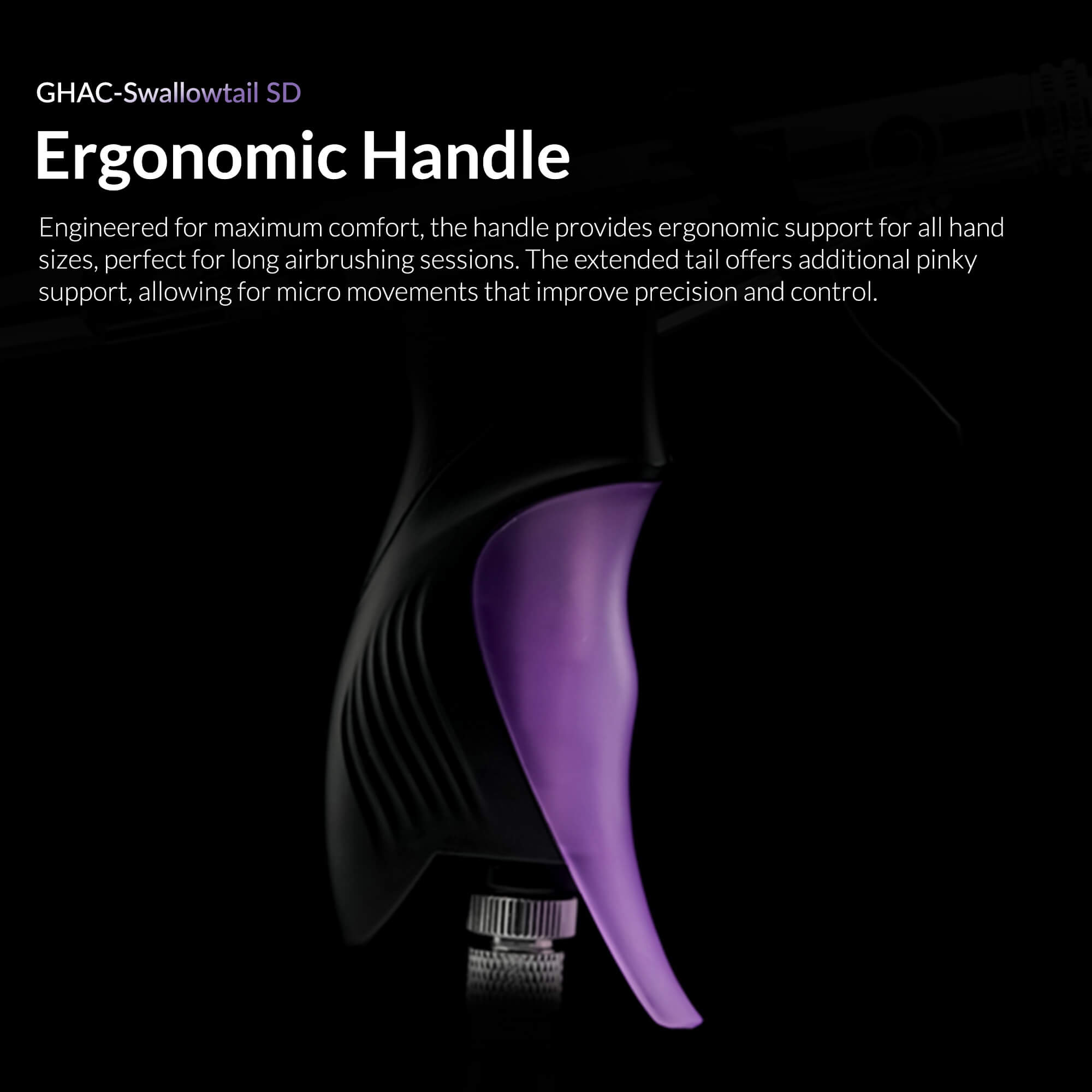 Designed for maximum comfort, the handle supports long airbrushing sessions with ease. The extended tail enhances precision, offering added pinky support for micro-movements.