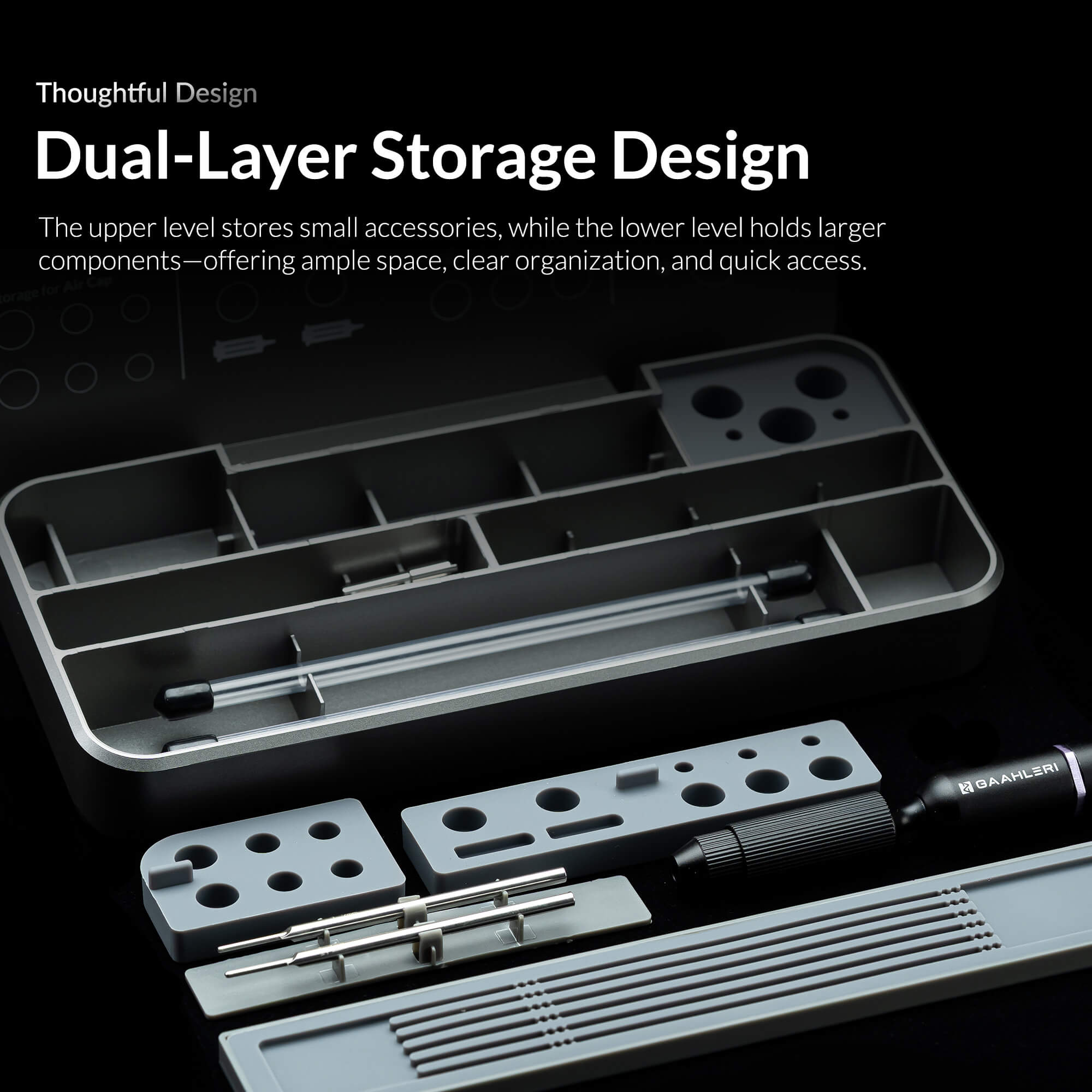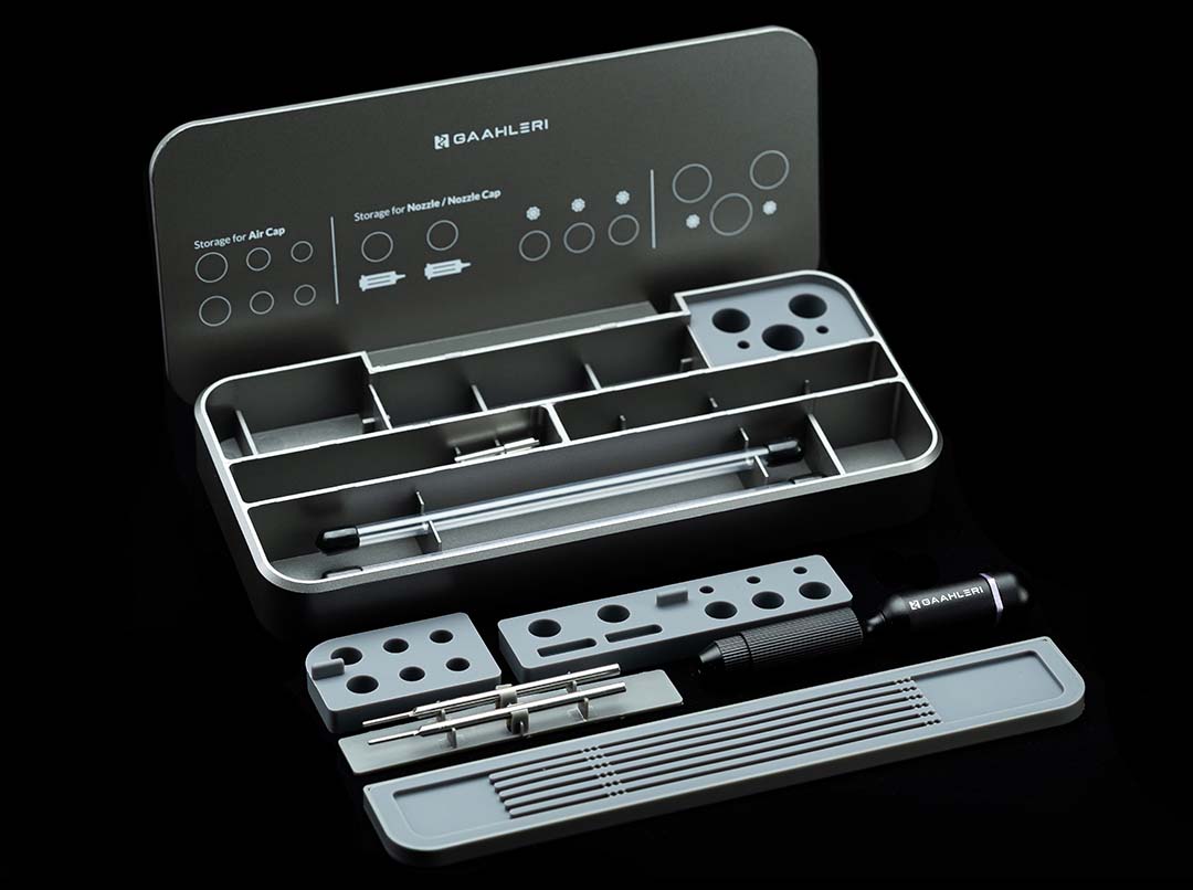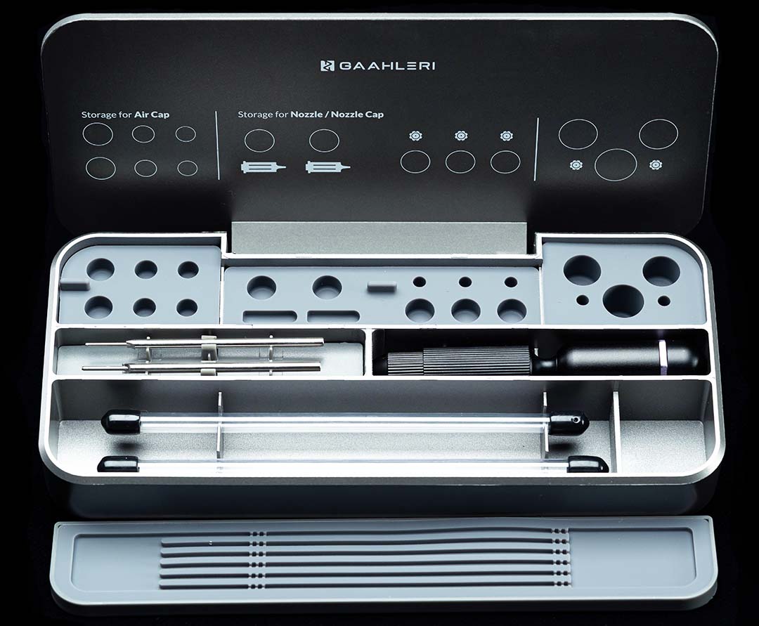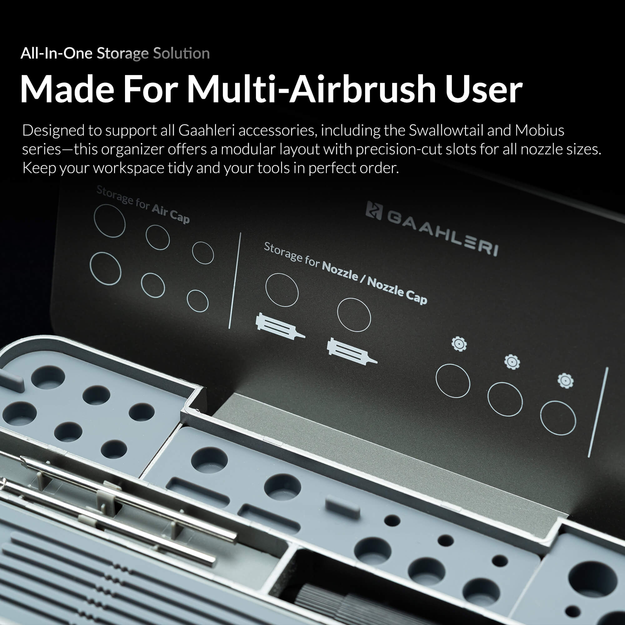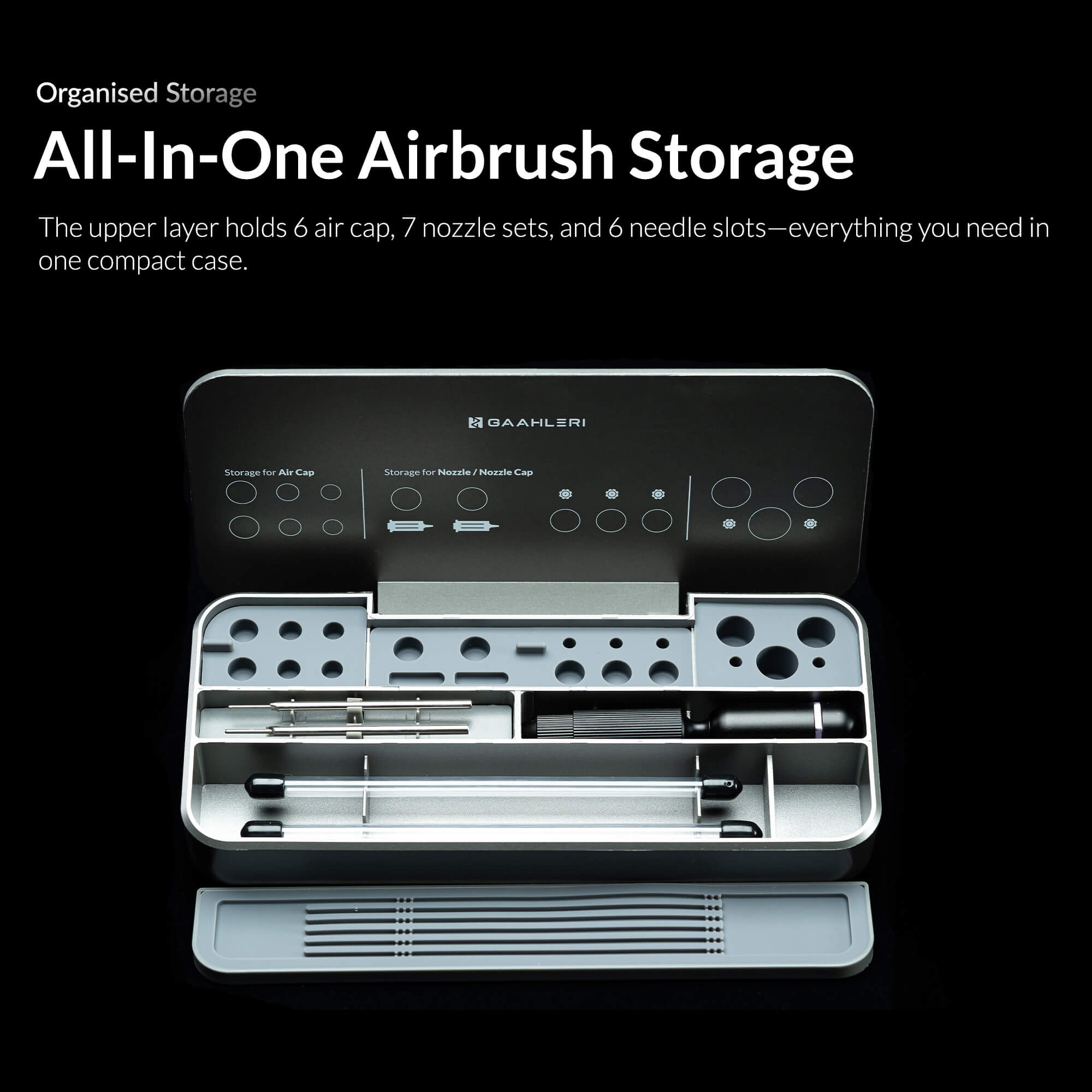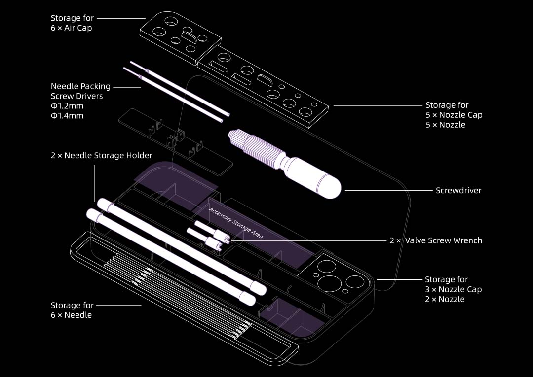 Featuring a two-tier modular layout, it securely stores your complete airbrush setup — from nozzles, needles, and caps to larger components. The upper layer accommodates 6 fan caps, 7 nozzle sets, and up to 8 needles, with added protection to prevent bending or damage. The lower compartment offers spacious storage for larger parts and accessories.